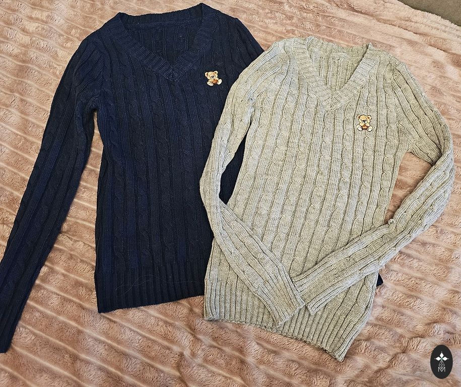 2 megztiniai ir pilka striukė geros būklės. Paskutinėje nuotraukoje matosi pūkeliai.