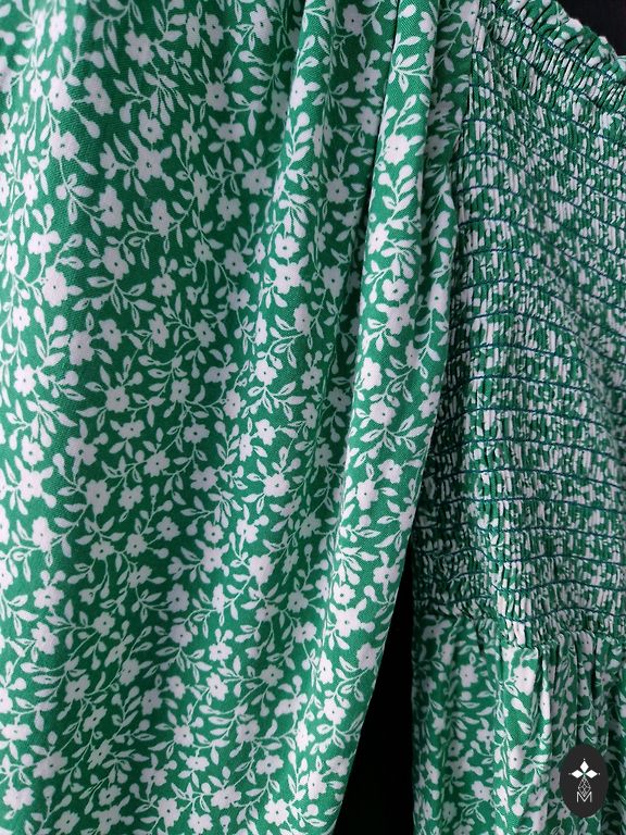Miško žalios ilgas suknelės su baltais žirneliais. Taškeliais rašto mėgėjai.