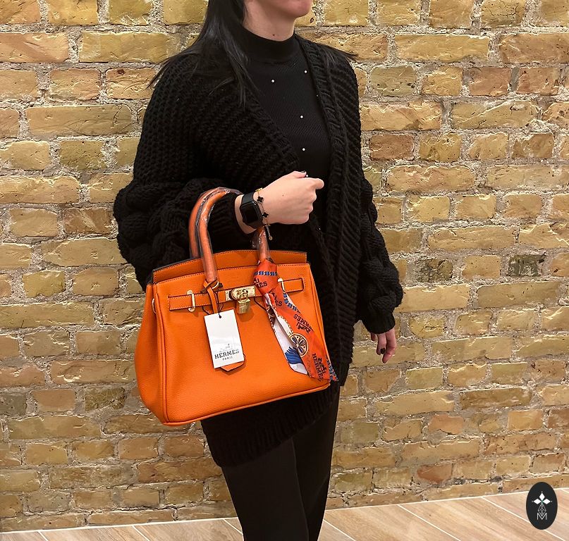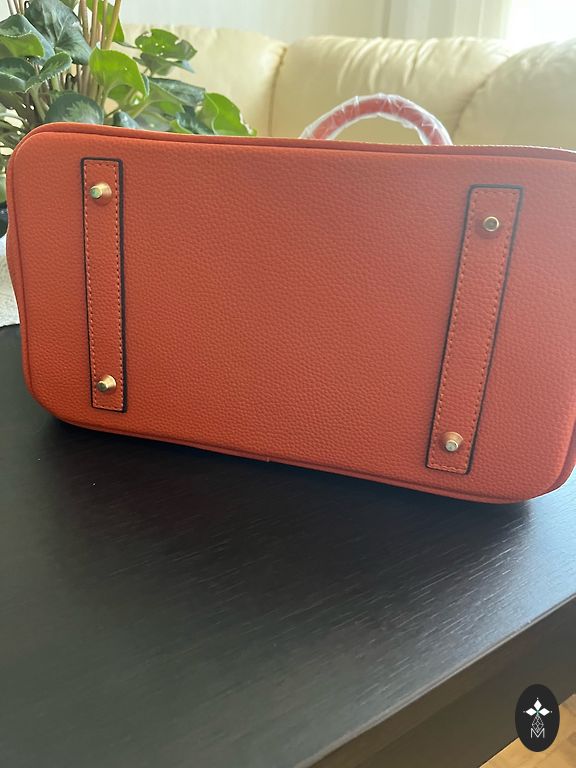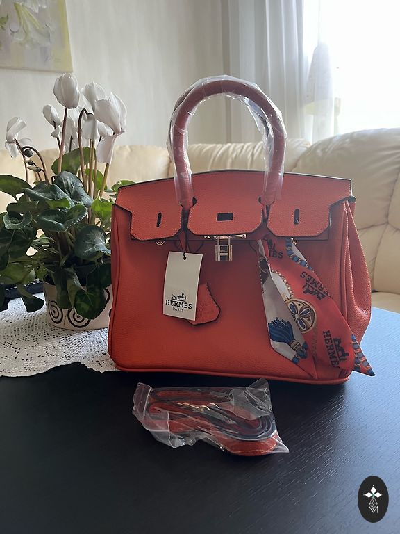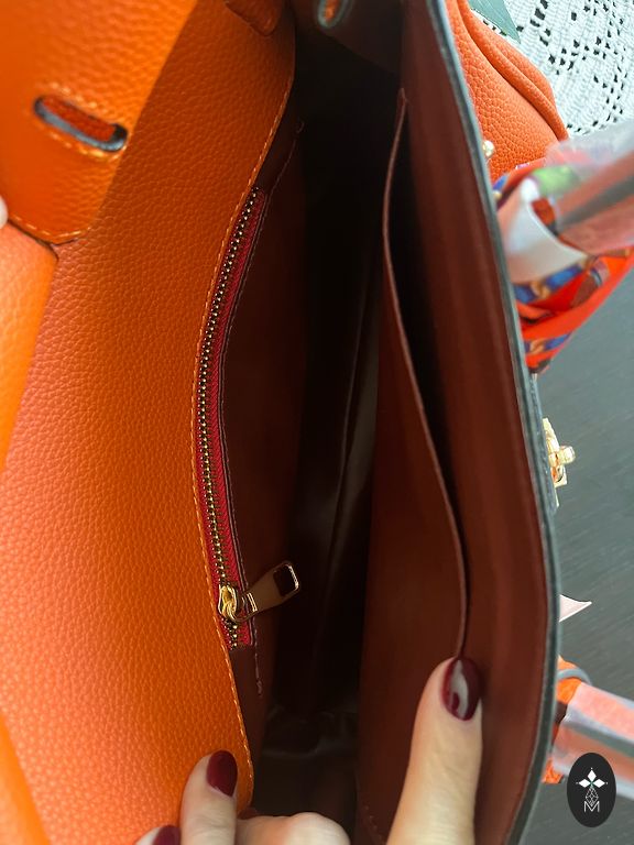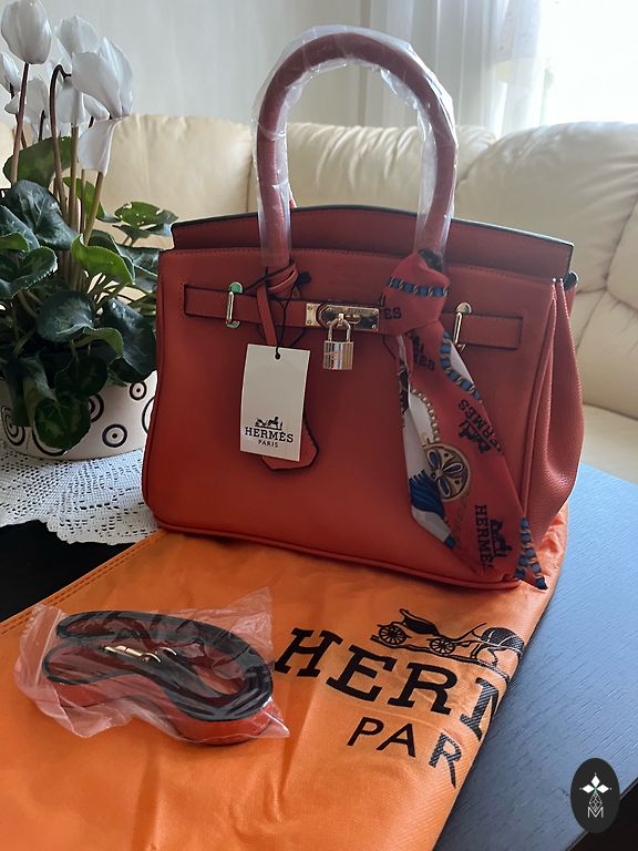 Ryškiai raudona, graži rankinė su trimis skyriais, vidinėmis kišenėmis (2 vnt.), paauksuotais furnitūra, pamušalu ir užtrauktuku vidurinio skyriaus uždarymui. Rankinė taip pat turi ilgą dirželį, kad prireikus būtų galima užsidėti ant peties. Rankinės matmenys: aukštis 24 cm, ilgis 34 cm.