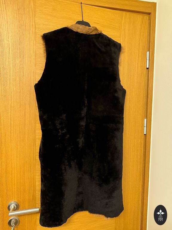 Kailiniai Tigrado (gamintojas Rokabi), dvipusiai (natūrali oda), stovas apykaklė. Labai šilta. Ilgis 87 cm, plotis 126 cm, rankovių ilgis 75 cm.