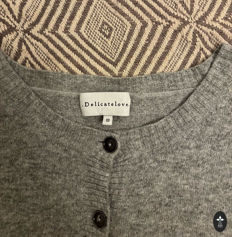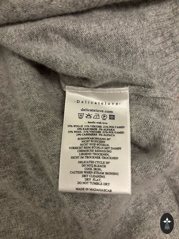 Custom-knit mohair sweater with a wool blend. No buttons. Although there is no composition label, the best way to determine the natural composition of the yarn is with a flame test - ignite a small piece of yarn (I can provide one or take it from the inside of the sweater) - synthetic materials burn well and form a hard charcoal ball. In contrast, natural fibers (wool, cashmere, mohair, etc.) extinguish quickly and the charcoal can be easily crushed into powder with fingers, it is not hard.