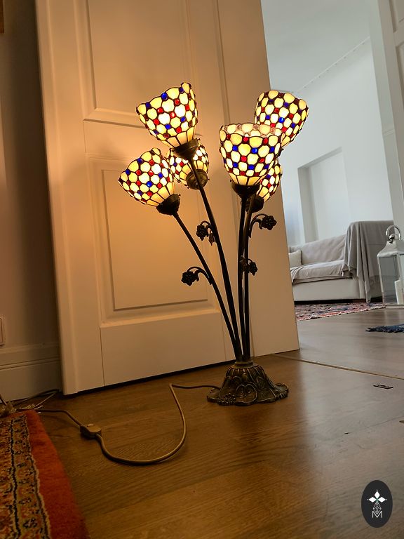 🌈 Kad ieslēdz gaismu, uzplaukst maiga pērļu gliemežnīca un lampa atdzimst perlamutrā. Lampa ir ievērojama izmēra, stabila. Augustums 60 cm, kupola diametrs 47 cm.Trīs spuldzītes, katru var ieslēgt atsevišķi. Derēs gan guļamistabas naktsskapītim, gan ká galda lampa. Lampa iegàdàta Vācijā.