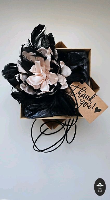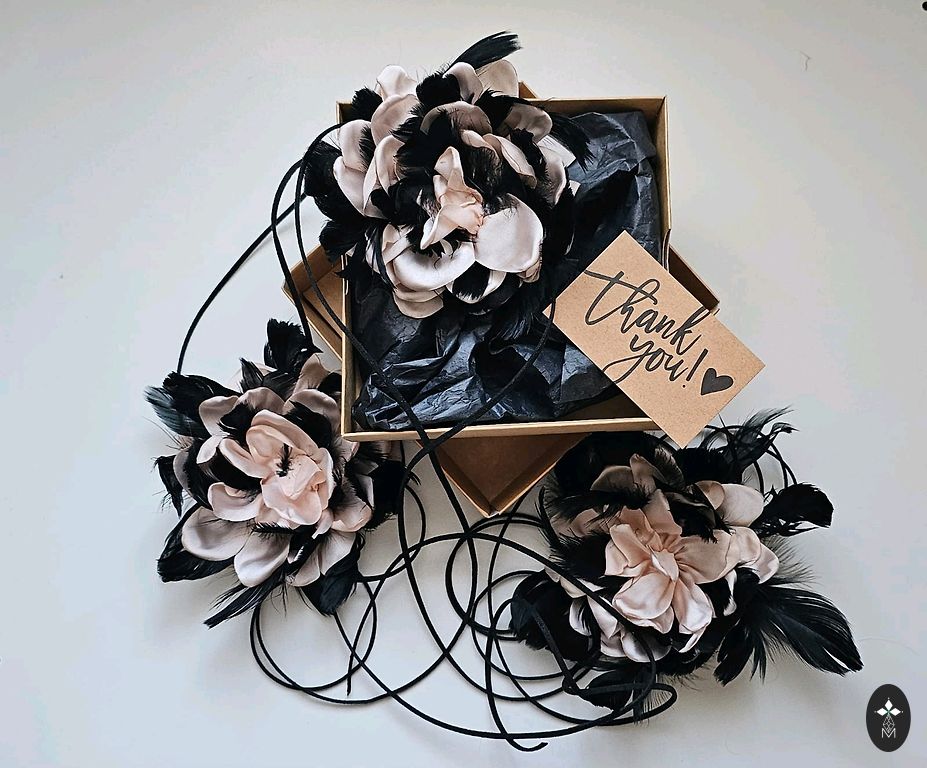 Добавь своему образу драму и элегантность! Это не обычное ожерелье, а настоящий аксессуар-стейтмент. Нежно-розовый сатиновый цветок с черными перьями на длинных завязывающихся шнурках.