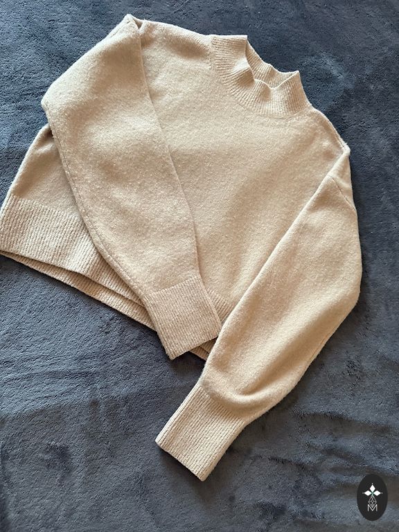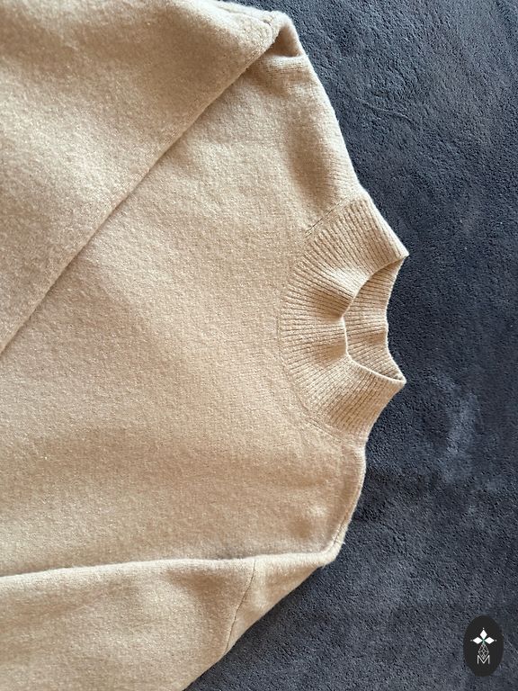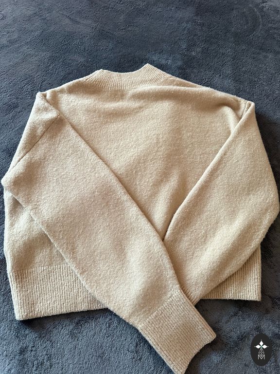 Мягкий, теплый свитер из 100% шерсти мериноса. Длина 52 см, обхват груди без растяжения 98 см.