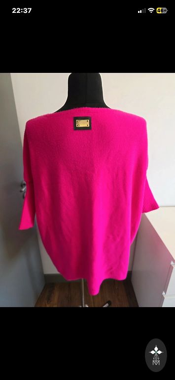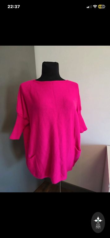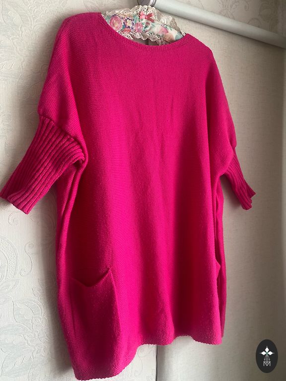 Rozā adīts džemperis S (36/38). V-veida izgriezums, blīvs trikotāža, saīsināts modelis. Krūtis 88 cm, viduklis 82 cm.
