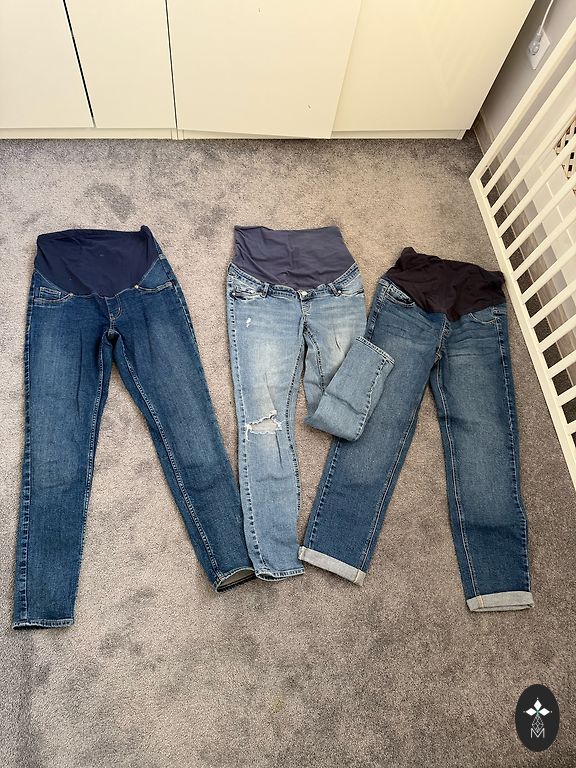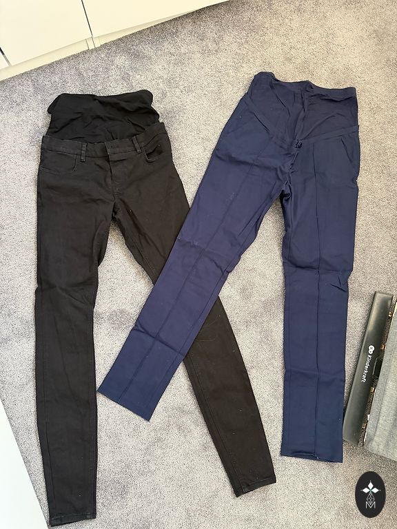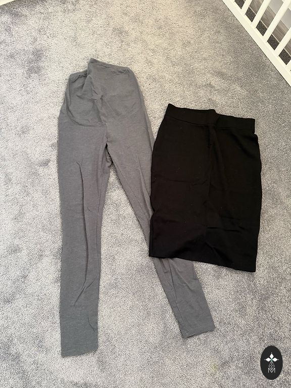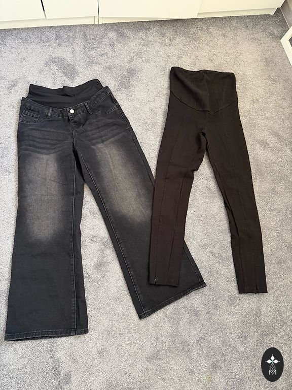 Три пары штанов + куртка, черные - теплые, флисовые, с утеплителем и регулируемой резинкой по бокам. Джинсы с низкой талией - размер 38, остальное - S. Мой размер в обычной жизни был xs/s. Кенгарагс или пакоматы.