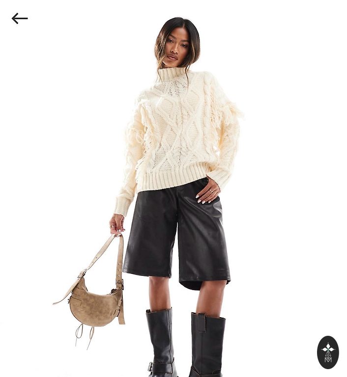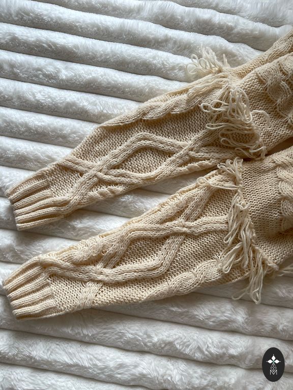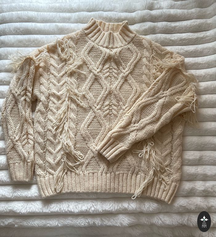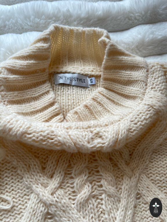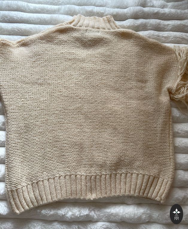 Laisvo stiliaus megztinis, šonuose skeltukai, nugaroje šiek tiek ilgesnis nei priekyje.