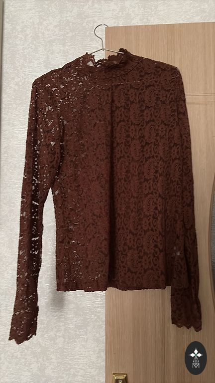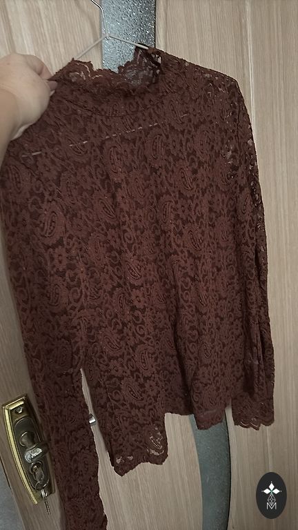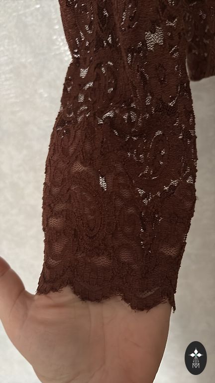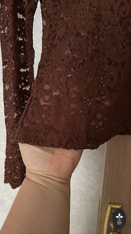 Luksuslik pitskangast (70% polüester, 30% viskoos) pluus roosikaunistustega pruunides toonides. L/XL suurus. Ilma voodrita, kuid mitte läbipaistev. Õlgadel väikesed padjad. 3/4 läbipaistvast kangast varrukad. Mõõdud: pikkus 61 cm, õlgade laius 43 cm, ümbermõõt kaenla all 51x2 cm, vöökoht 47x2 cm, puusad 54x2 cm, varruka pikkus 54 cm.