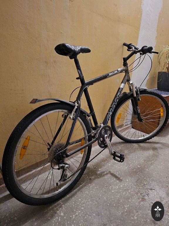 Велосипед Giant с большим рамой XL/58 см, колесами 28 дюймов. Амортизация на переднем колесе и сиденье. Требуется обслуживание.