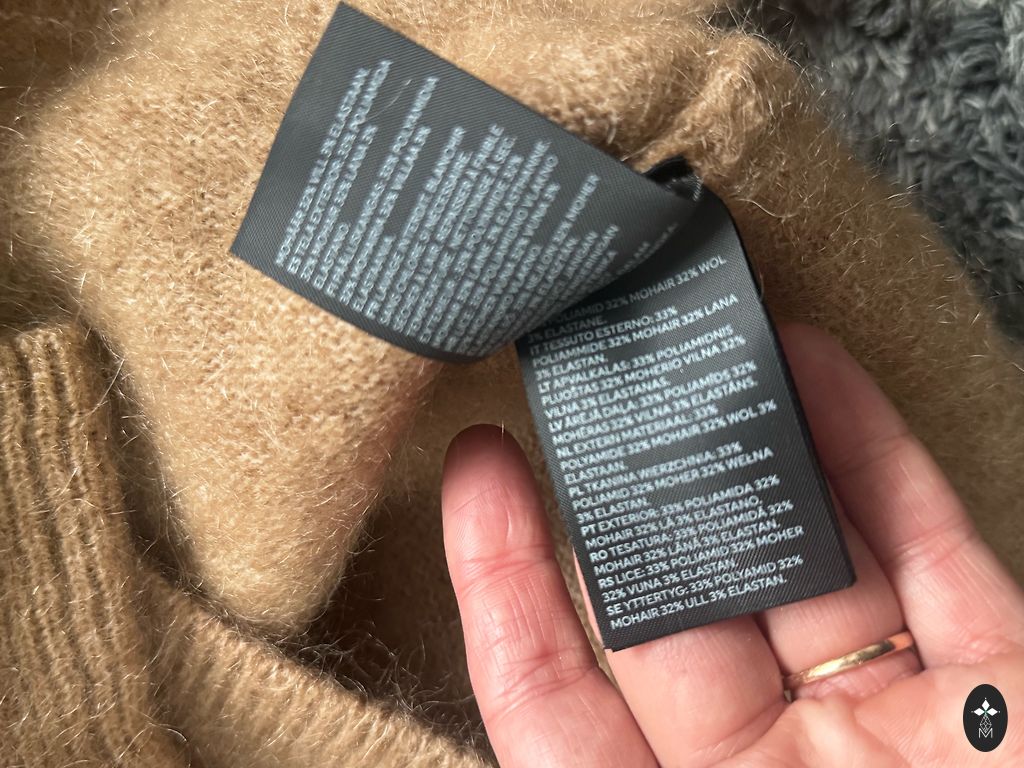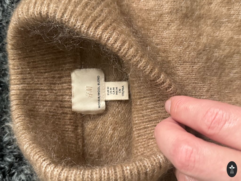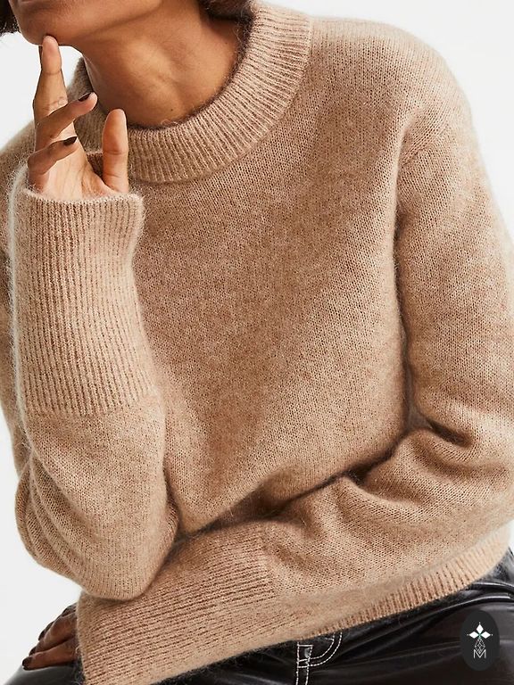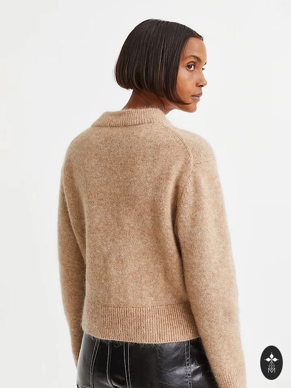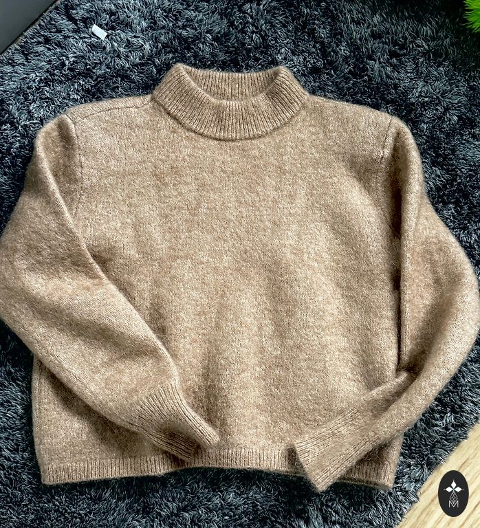 Бежевый свитер с воротником и карманами.
