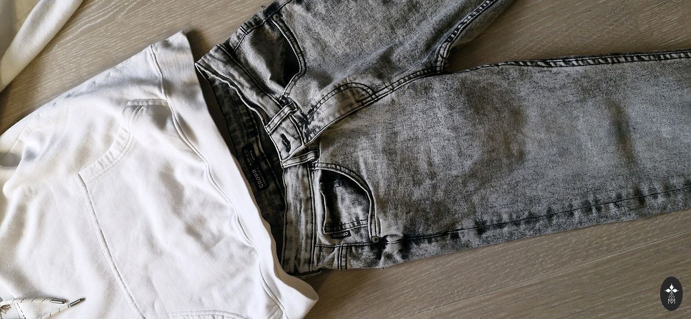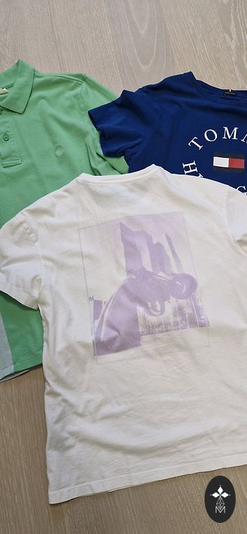 Vienas polo yra ilgomis rankovėmis, antrasis trumpomis rankovėmis. Mėlyna liemenė su guminiu kraštu apačioje ir gražiais pečiais puikiai dera su baltais polo.