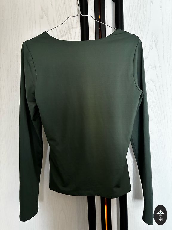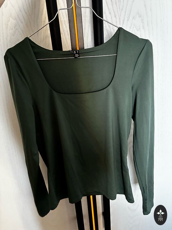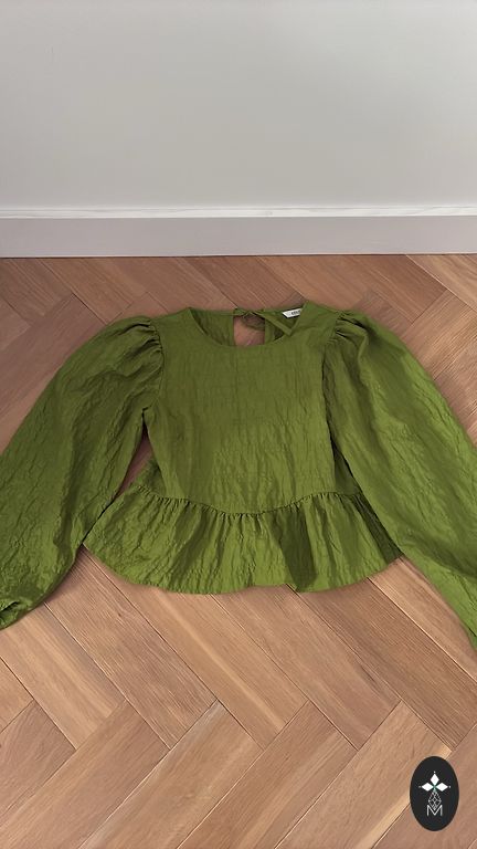 Zaļa blūze izmērā S, bet der arī M. Raksturīgas nedaudz uzpūstas piedurknes un unikāls rakstu dizains. Nedaudz nēsāta, bet labā stāvoklī.