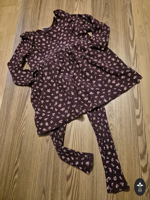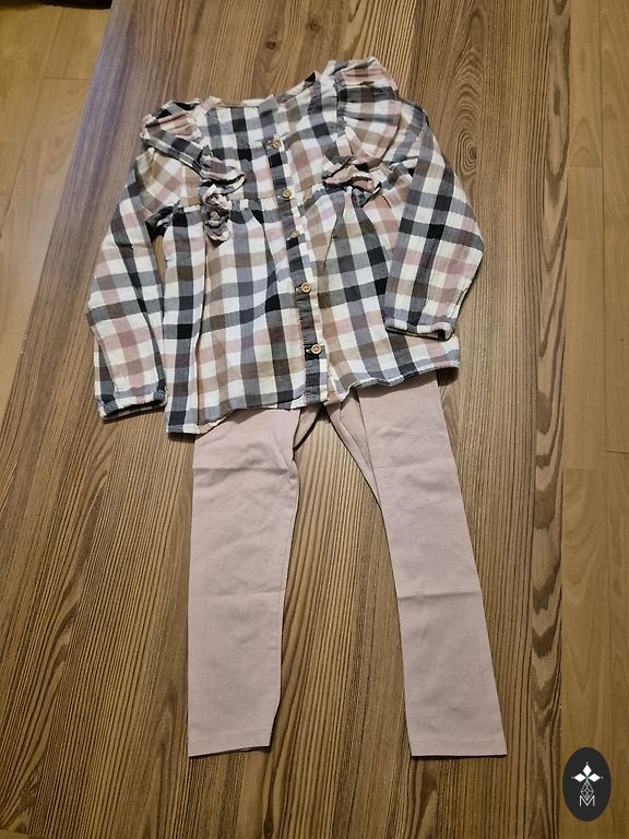 110 dydžio drabužiai, flanelinė striukė, suknelė, megztiniai, kelnės ir maudymosi kostiumėlis.