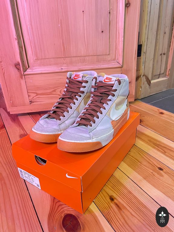 Stilīgi Nike Dunk Low tipa sporta apavi zilā, baltā un oranžā krāsu kombinācijā.