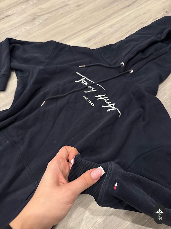 Dense cotton, with pockets. Very high quality. Length 103 cm, chest 94 cm, waist up to 78 cm.