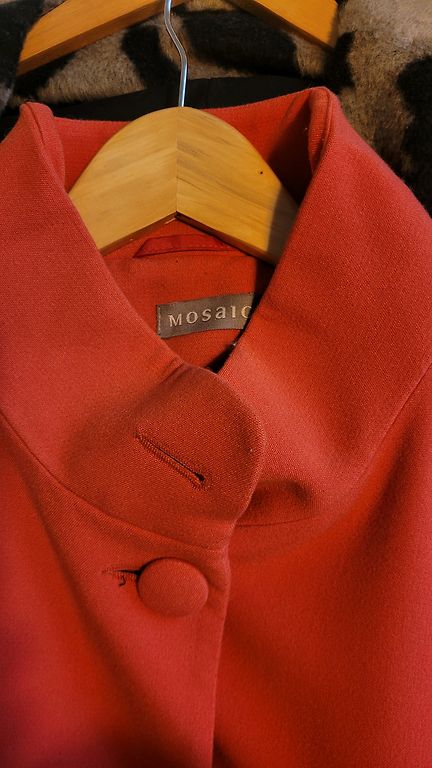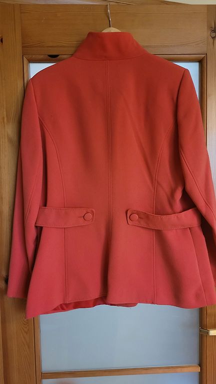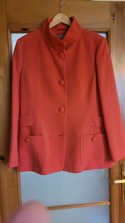 Brioni oficiālais veikals— ekskluzīvs, pēc pasūtījuma šūts apģērbu zīmola veikals. Eleganta-loti miksts, patikams audums,( kasmirs, vilna). Kosa , loti skaista lašu krasa. Piedurknu galos un aizdare ar skaistam pieskanotam pogam. Krutis 104, garums 73 cm. Noradits 44. izmers, bet der labak 42.