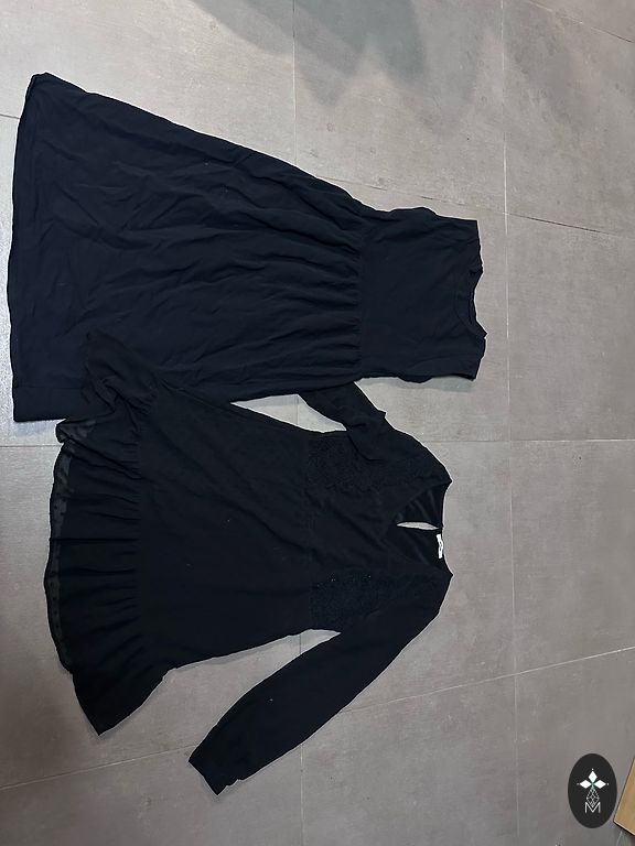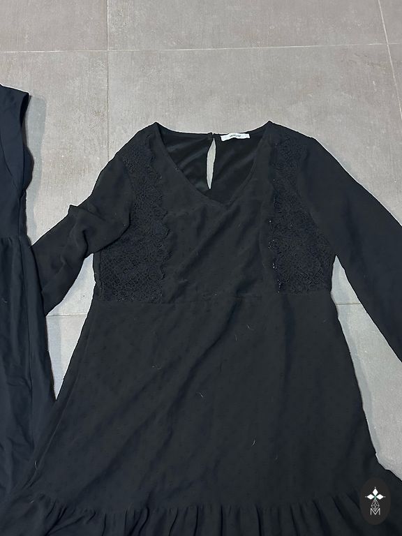 Suknelė iš poliesterio audinio su tiulio dekoru ir smėlio spalvos atlaso apatiniu sijonu, kuris yra nuo krūtinės iki apačios. Tinka tiek šventėms, tiek kasdienai, pirkta Šokolade. Matmenys krūtinėje 50 cm, bendras ilgis 105 cm.