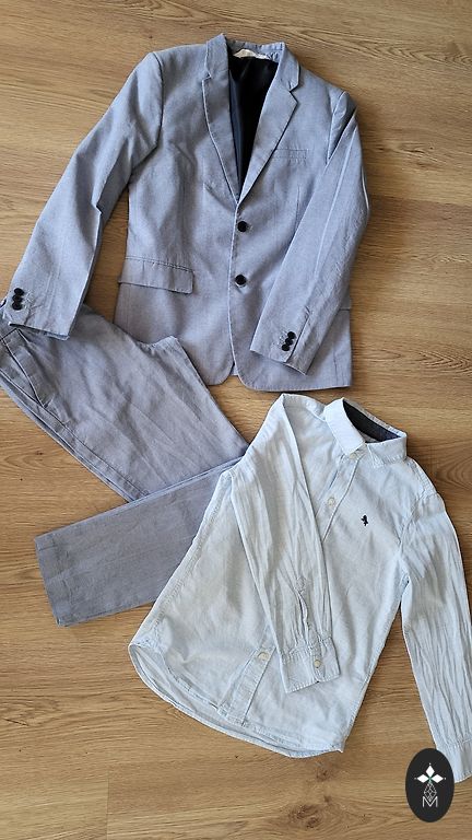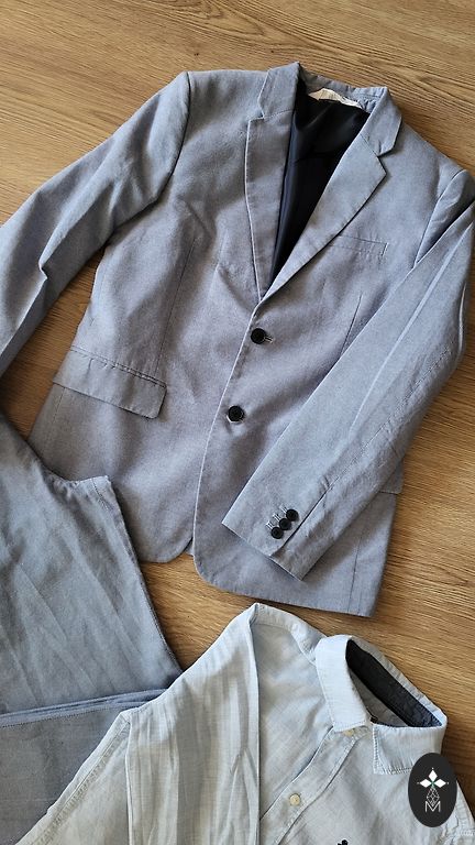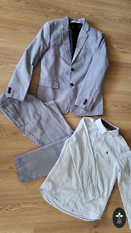 Parduodu stilingą berniuko šventinį komplektą – idealiai tinka šventėms, išleistuvėms ar fotosesijai. Komplektą sudaro švarkas, kelnės ir marškiniai šviesiais, elegantiškais atspalviais. Viskas geros būklės.