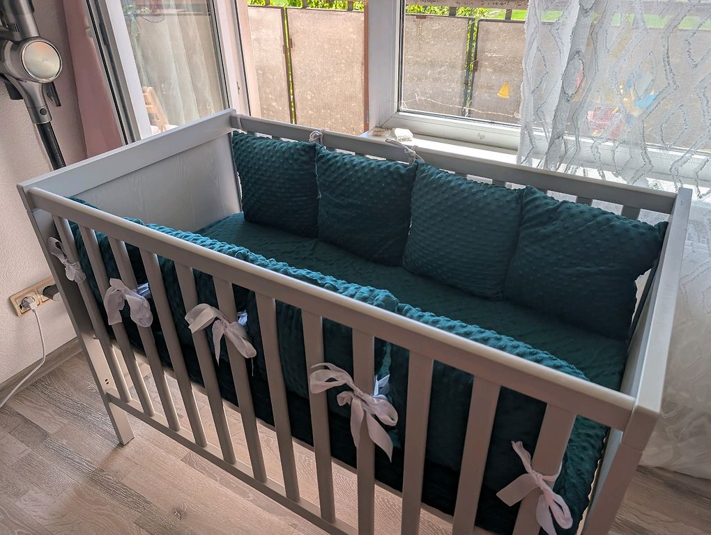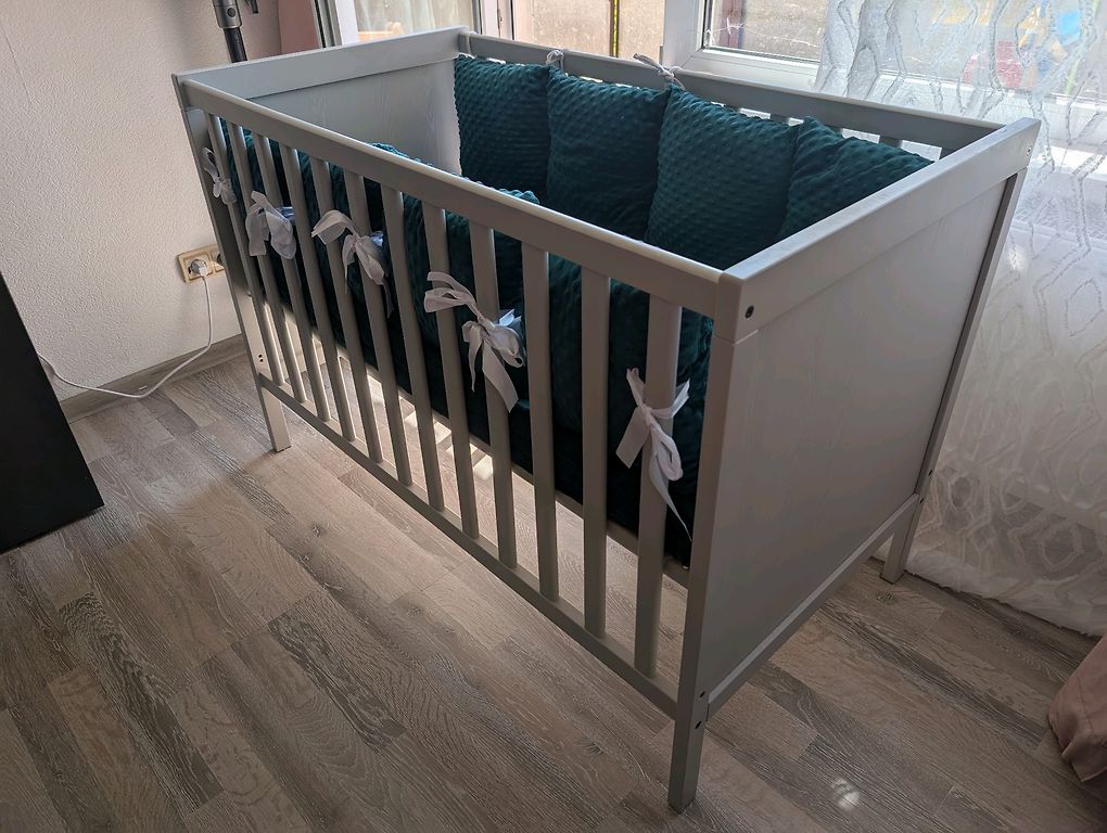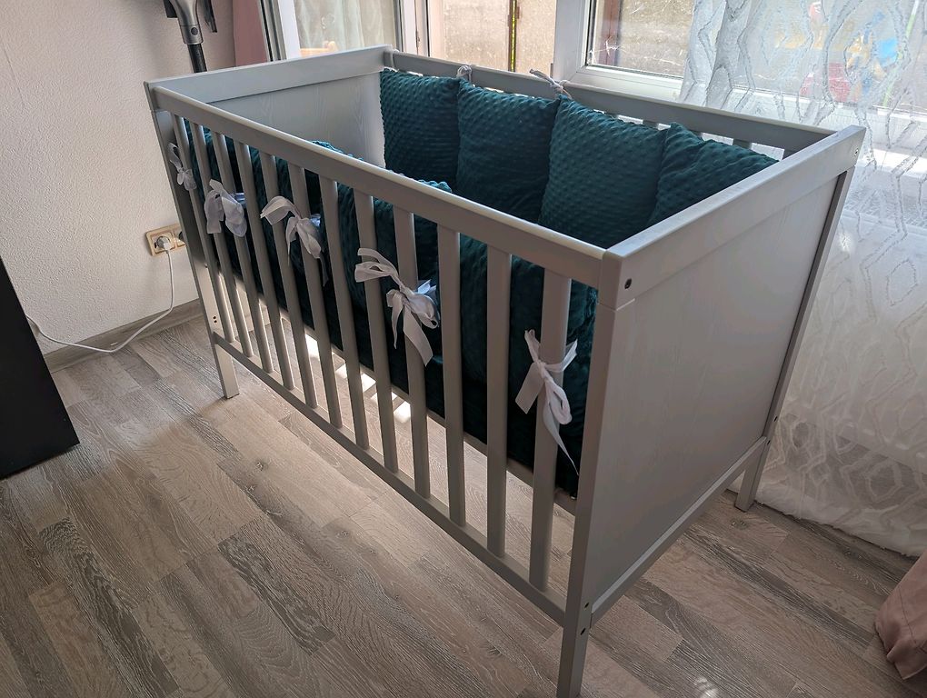 Removed edge also included. There are 2 mattresses, you can choose which one you prefer, you can take both. The other as a spare. The crib is made of wood, in good condition. It perfectly fulfills its function. Located in Riga, self-pickup.