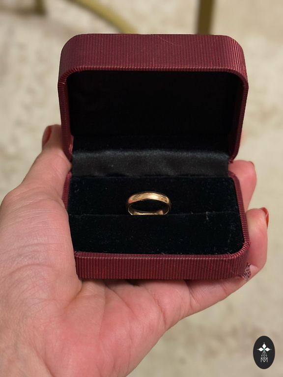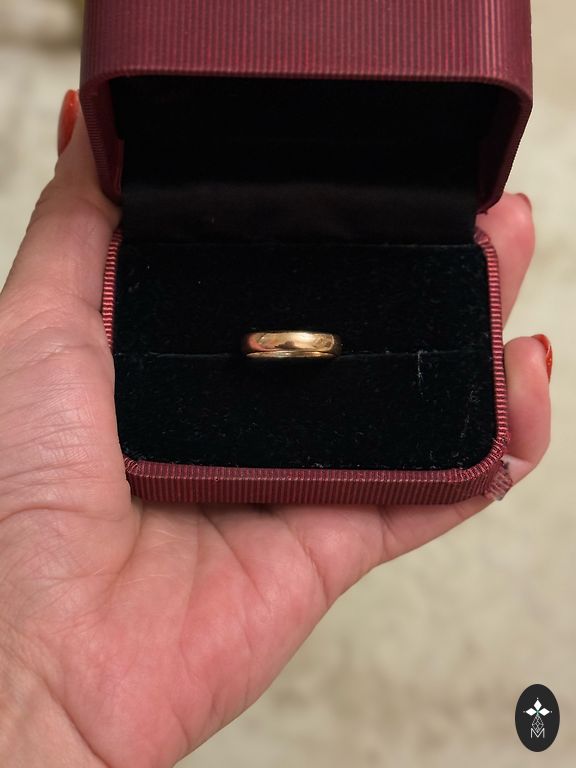 Auksinis žiedas 18,5 dydžio. 585 praba. Deja, nežinau svorio..