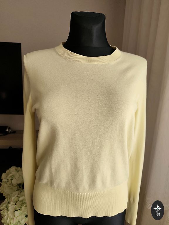 Labai šiltas, gražus ir minkštas megztinis iš kokybiškos Kid moheros siūlų. Švelni geltona spalva, su ilgomis rankovėmis. Krūtinės apimtis 120/130 cm, ilgis 57 cm.