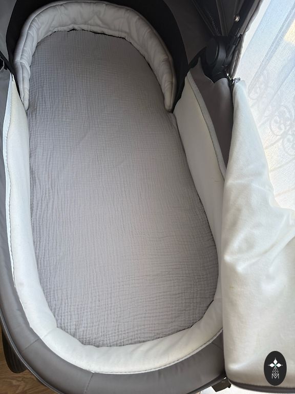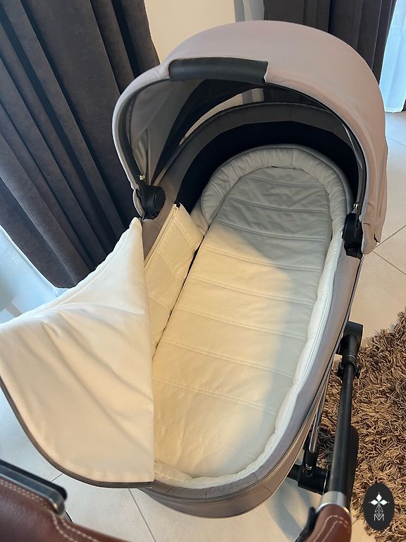 Lopšio vidus šviežiai išplautas. Pridėsime ir originalų lietaus apsiaustą abiem vežimėlio dalims bei uodų apsauginį tinklą.