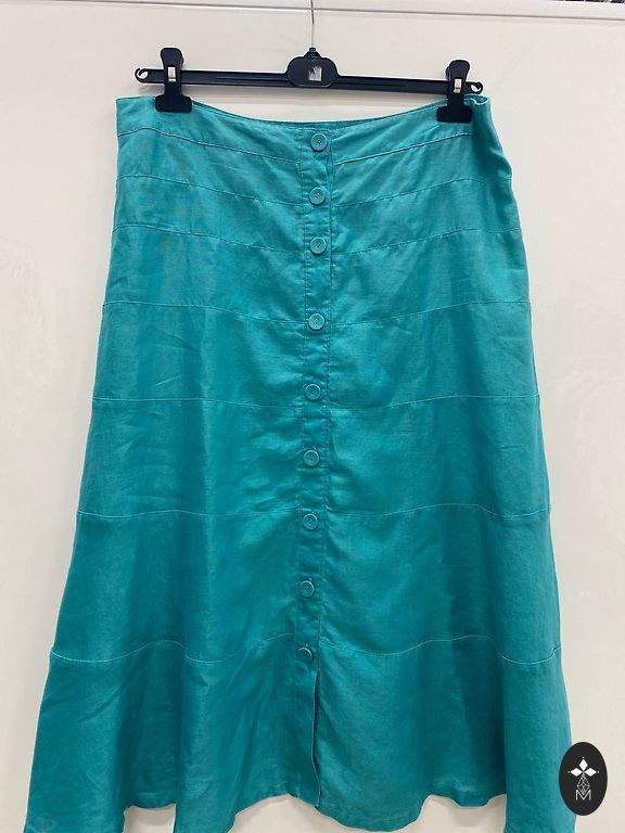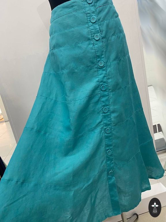 Новая, плотная, качественная и хорошо драпирующаяся юбка из ткани - 40% шерсть, 60% полиэстер. Талия 49x2 см, длина 83 см. Сзади разрез. Цвет весенне-яркий - на фото не совсем точный, юбка скорее сине-зелёная.