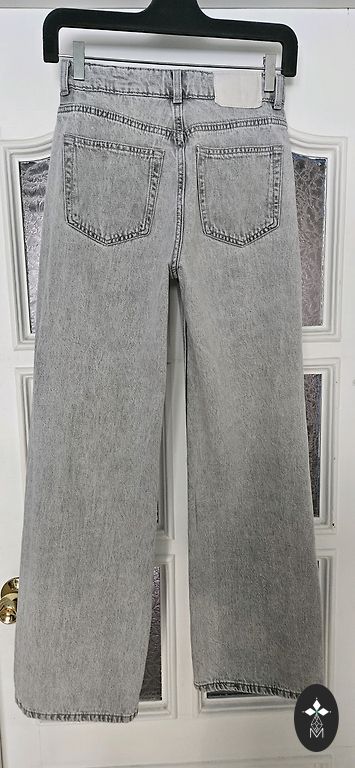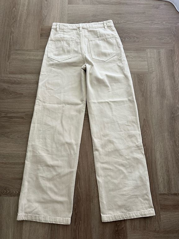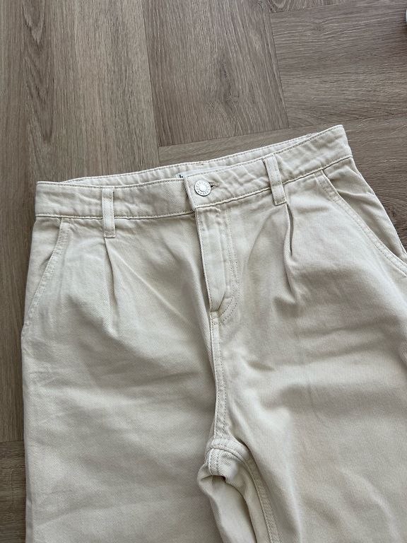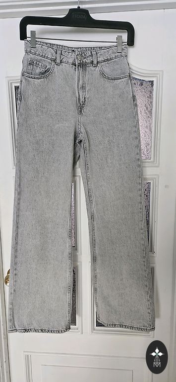 Uzvilktas vienu reizi. Mango Selection kolekcijas denim bikses. Augstu jostas vietu, platas, taisnas.