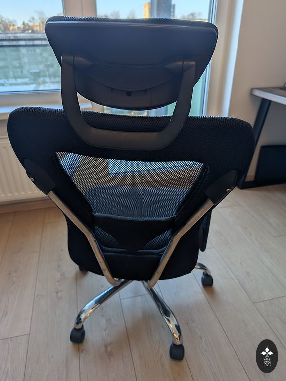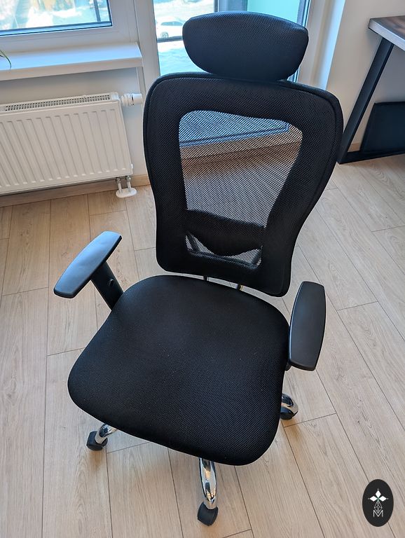 Kėdė gana sena, atlieka savo funkcijas - pakėlimo-nuleidimo mechanizmas veikia. Nėra išsėdėta, bet matomi katės nagai. Puikiai tiktų kokiai nors garažai.