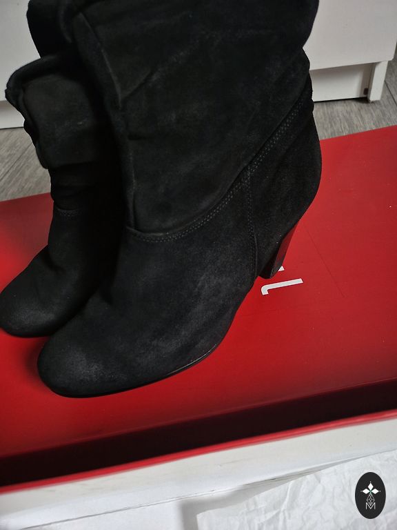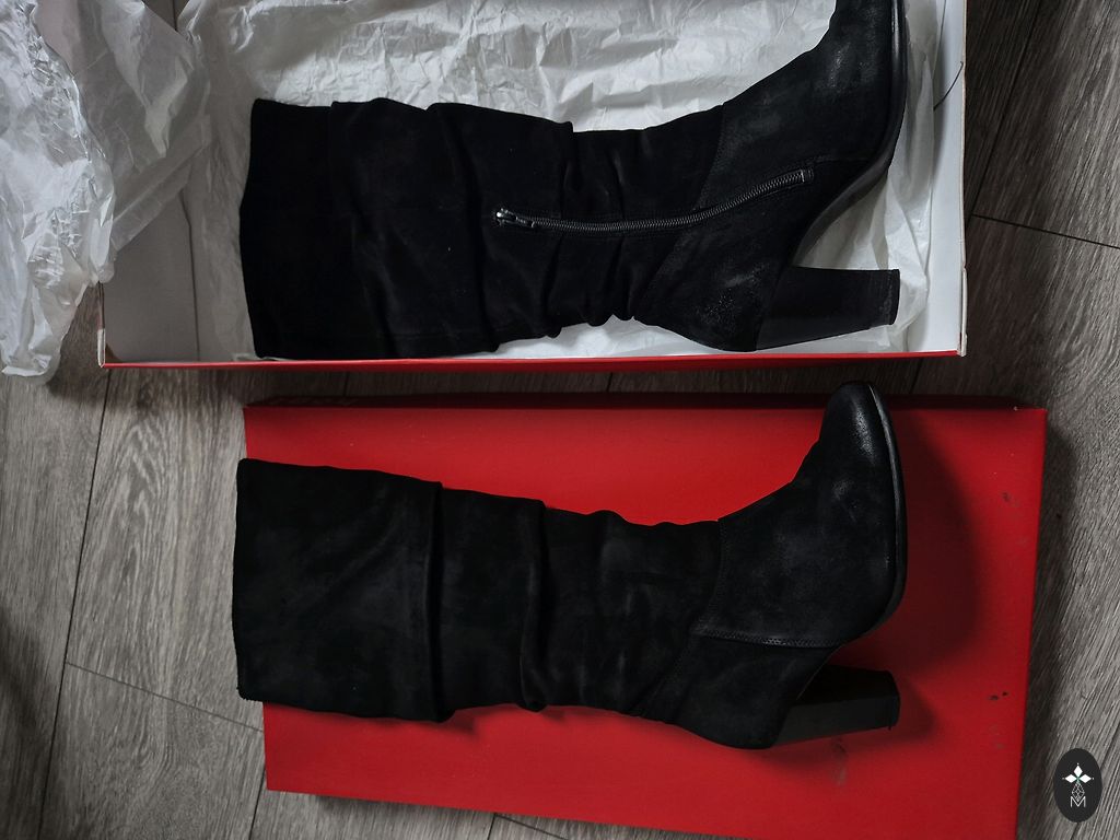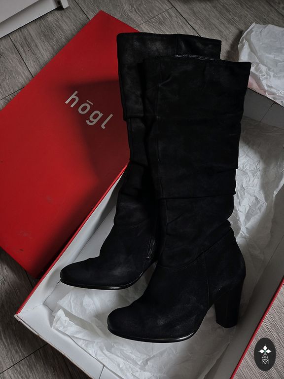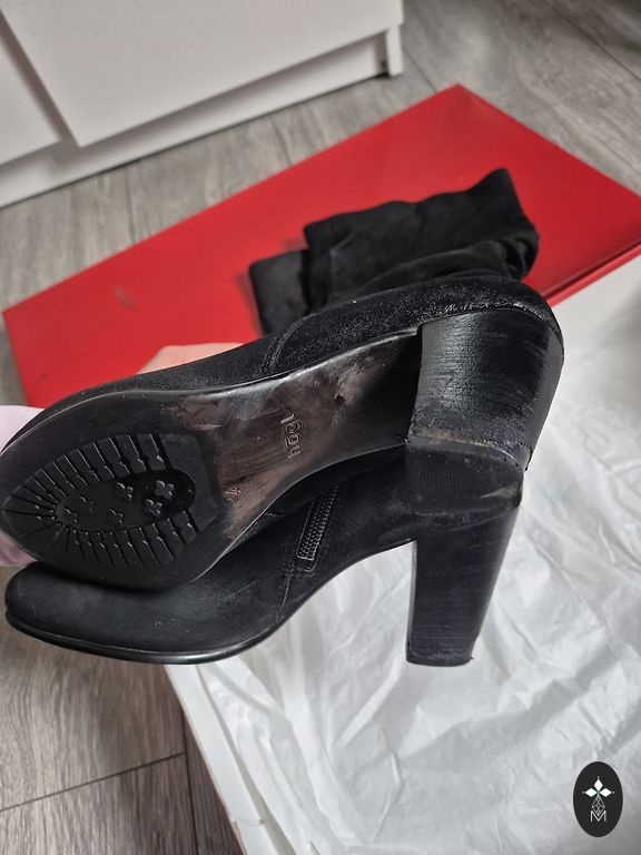 Очень удобные и элегантные высокие сапоги. Надевались несколько раз, к сожалению, больше не подходят. Каблук 8 см, верхний край 20 см. В целом в хорошем состоянии, существенных дефектов нет, только мелкие следы использования.