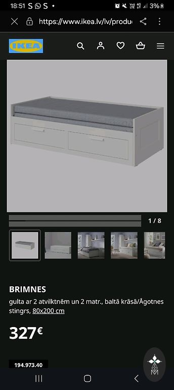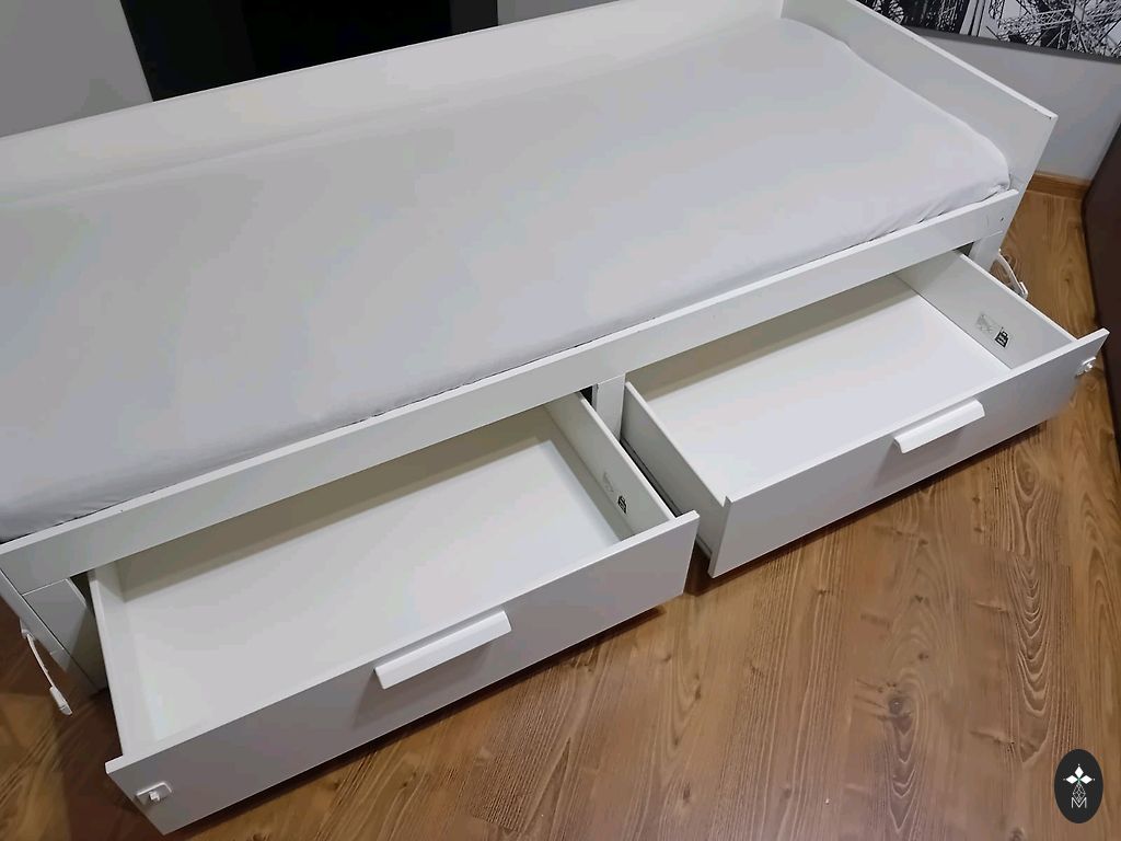 Selling our excellent bed/sofa due to moving. Very comfortable during the day - used as a sofa with two mattresses measuring 80x200cm, great as a bed for the daughter and when needed - extends to 160x200cm as a bed for guests! Selling without mattresses. The bed has two large linen drawers to store everything necessary. Max weight 20 kg per drawer. There are two minor scratches, but really small. Classic, excellent design that will fit in any home. The child safety fittings seen in the picture will be removed without a trace. One mattress will be available, but only by the end of next week when we bring it from our home in Liepāja. The bed will be available in disassembled form.