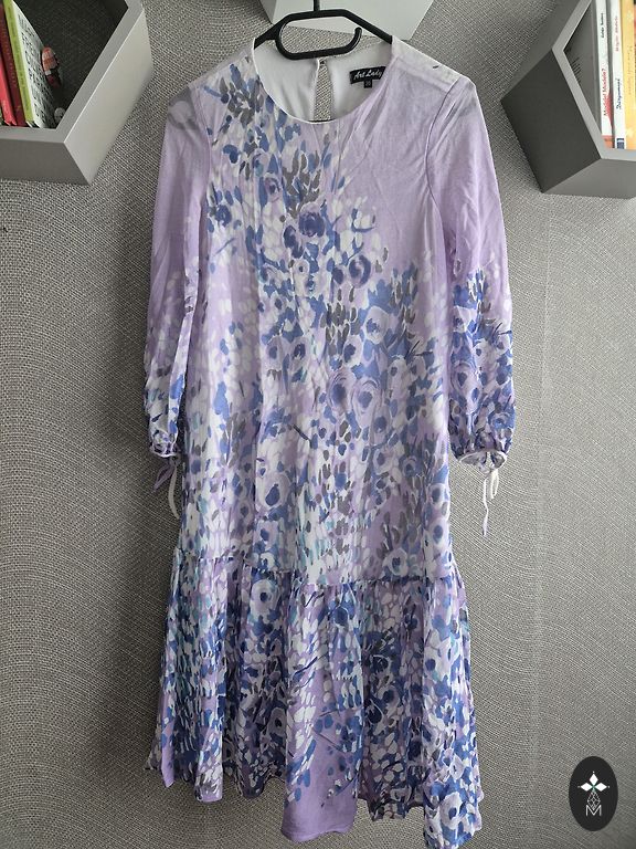 Geros būklės marškinėlių tipo suknelė, trapecijos kirpimas, sodri oranžinė spalva, audinys su reljefu - nėra lygus. Rankovės su manžetėmis ant sagos.
