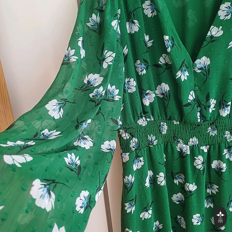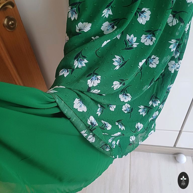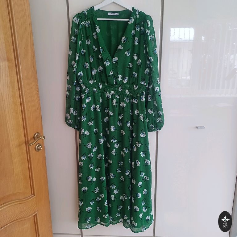 Dress approximately 100 cm in length, 55×2 cm wide in the chest area, free at the hips. Can also be worn with leggings. Fabric without lining, non-stretch. Sleeves are half-length. Fabric is not elastic.
