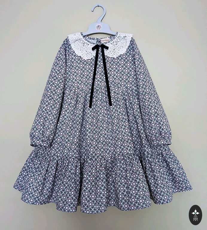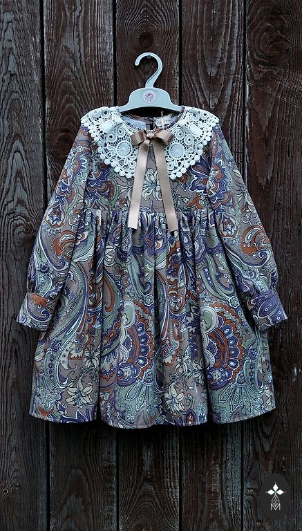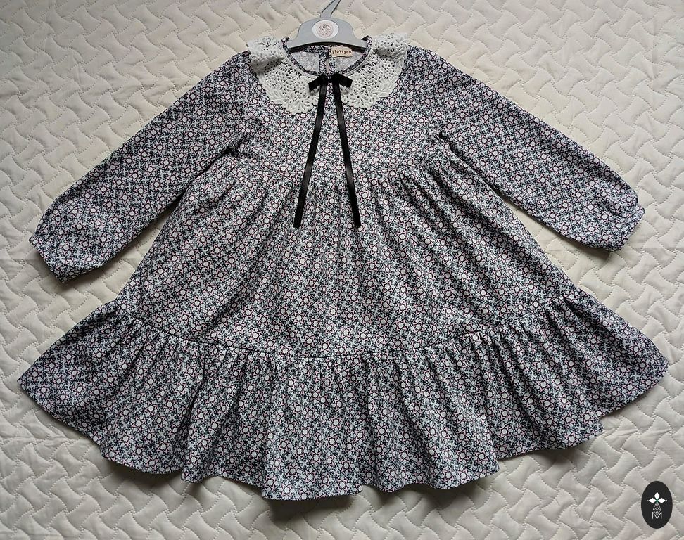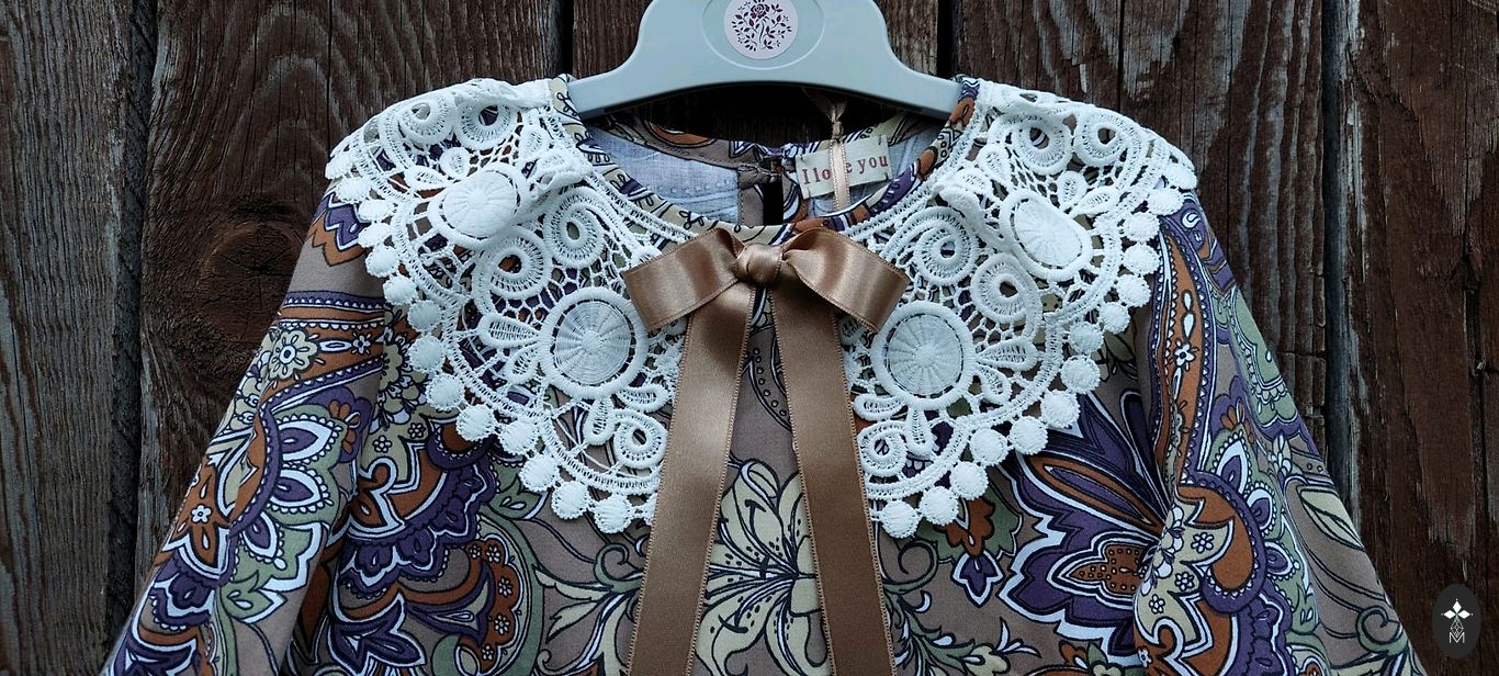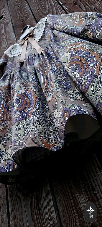 A voluminous, vintage-style dress with roses in size 110/116. Length 63 cm. High-quality 100% cotton satin fabric in beige-brown color with "old pink" colored roses. Very good quality. Since it's patterned, stains are not noticeable. Sleeves are 3/4 length. Shipping 1.99 Omniva, DPD.