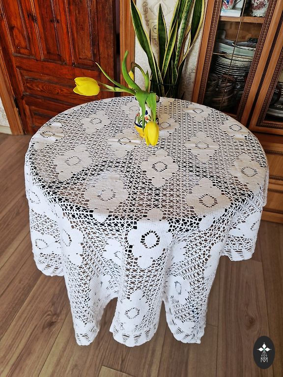 Dydis 129*169 cm. Staltiesė yra ryškesnė nei nuotraukoje, šviesūs kampai tamsesni - gelsvai rudi. Maža juostelė staltiesėje yra aukso spalvos. Medžiagos negaliu nustatyti, gerai lyginasi.