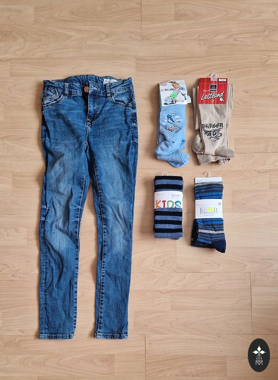 12 vienetų rinkinys 140 dydžiui, drabužiai yra ir nauji, su etiketėmis, ir naudoti, gali būti kokių nors nusidėvėjimo požymių, bet defektų nepastebėjau. Prekės ženklai įvairūs - H&M, Next, tt.
