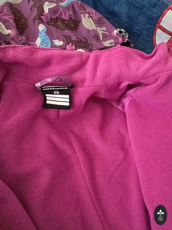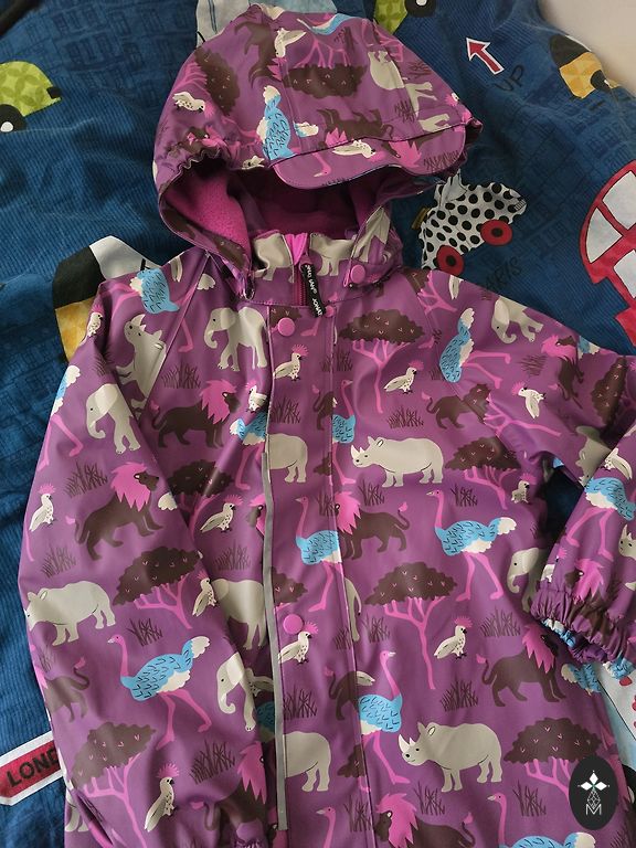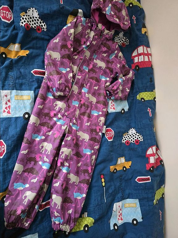 Didriksons vihmakomplekt ilma soojustuseta. Suurus 110, mis sobib kindlalt vähemalt kuni 120 cm pikkusele. Pildil on näha kasutusjälgi (kulunud nööp, üks jala kumm purunenud ja asendatud ning jaki sees plekk).