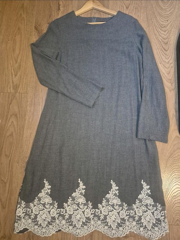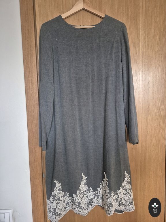 44 izmēra mīksta, silta ziemas-pavasara kleita, pelēcīgi zaļā tonī, viskoze+poliesters. Krūšu daļa nestiepjot 120cm, garums 107 cm, rokām skaista manžetes aprocīte.
