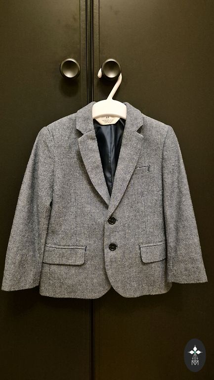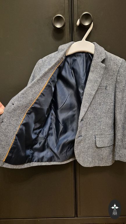 Šviesiai pilka H&M švarkas berniukui, kurio ūgis yra 134.