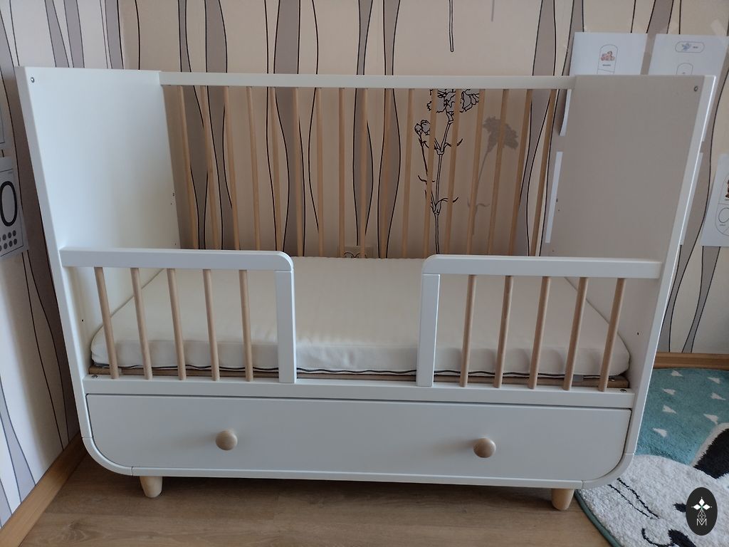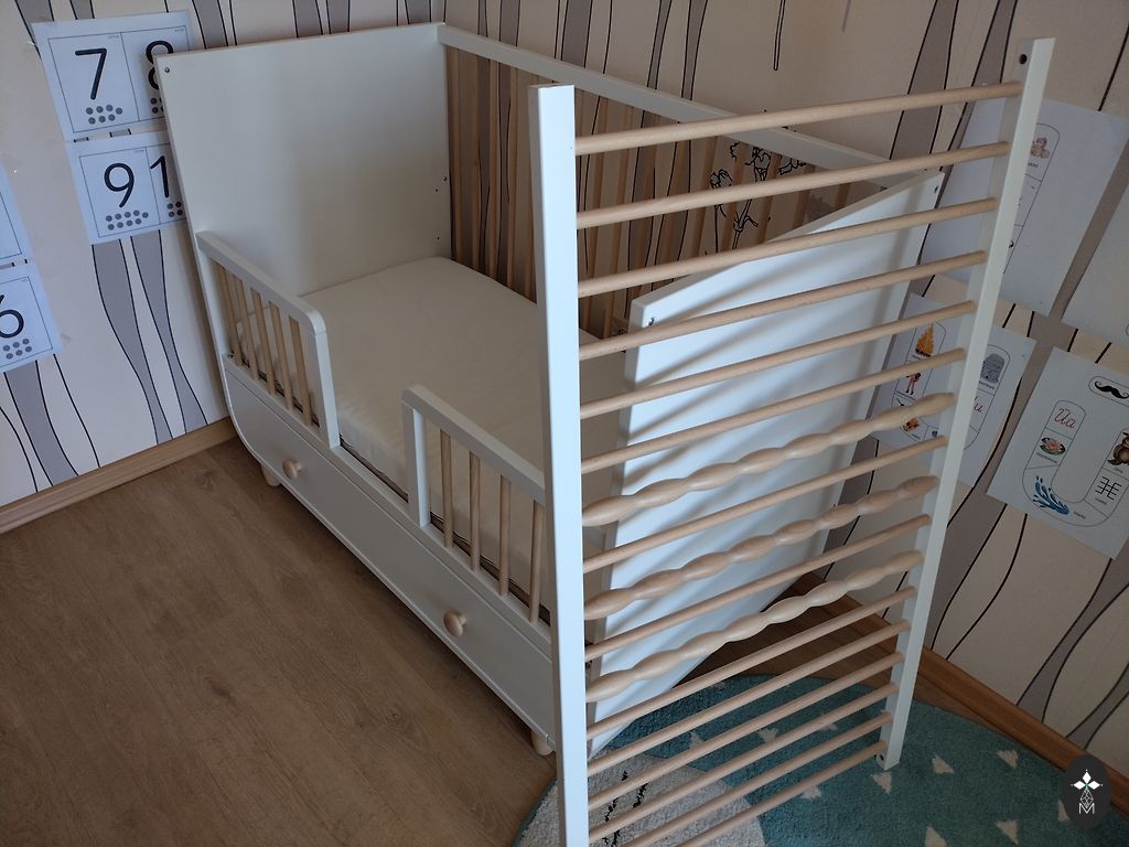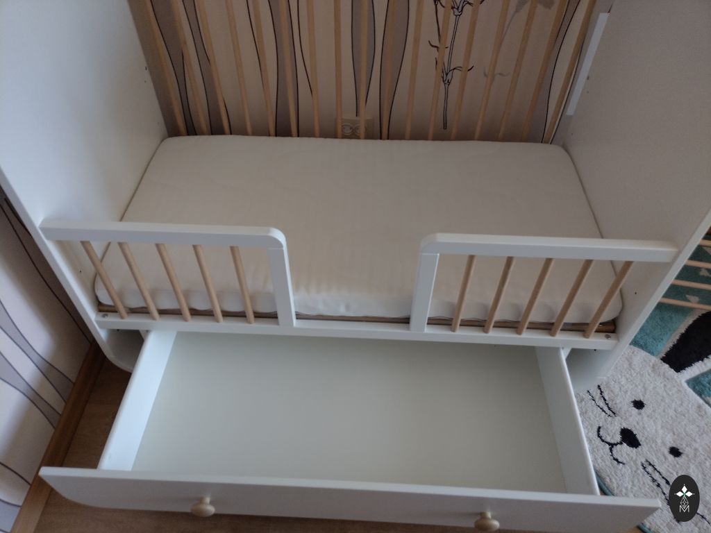 A highly functional crib that can be transformed into 3 different sizes as the child grows. The crib is in perfect condition, made from stained pine solid wood - no parts or screws are broken or loose, truly an exceptional quality product, certainly will accommodate many more children. There may be some minor scratches from use, but nothing visually noticeable. Included are LURÖY bed slats, 80x200 cm.