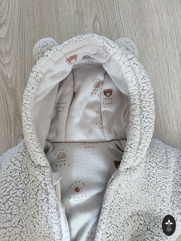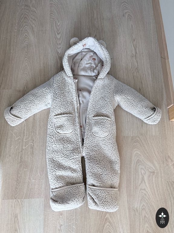 Awesome softshell jumpsuit. Length from shoulder to bottom is 72 cm, inseam 27 cm. Size 80, but it's larger, I would say plus 6 cm.