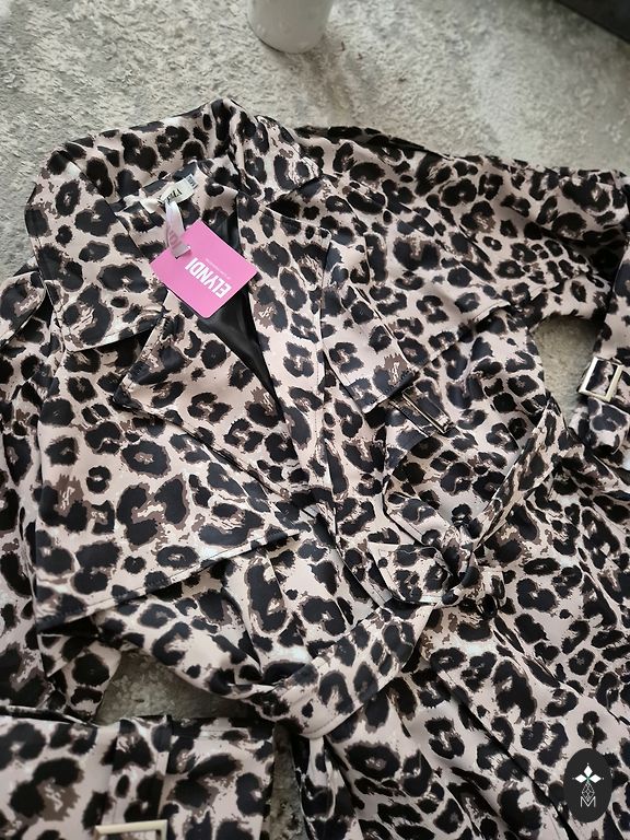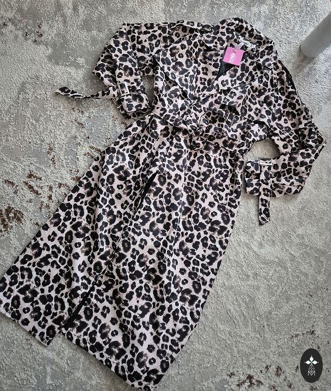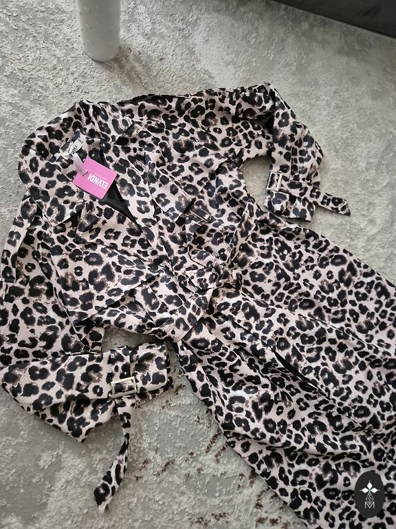 Naujas, zomšinis šokolados spalvos lietpaltis, pamušalas, diržas su metaliniu užsegimu. Užtrauktukas, paslėptas užsegimas su 3 kniedėmis.