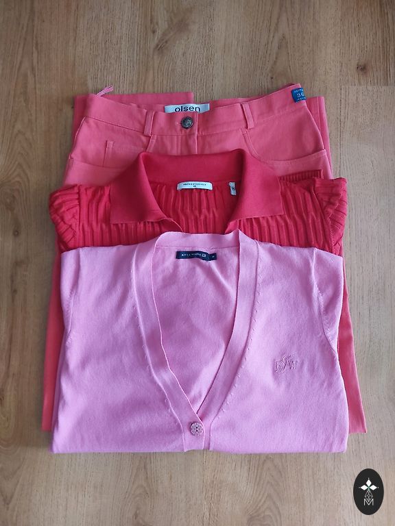 Didelis maišas su įvairiais drabužiais. Yra S, M ir L dydžiai. Iš esmės viskas dėvėta ant M dydžio kūno. Nuotraukose ne visi drabužiai matomi. Kai kurie drabužiai nauji, kai kurie turi dėmių. Nieko nedalinu.