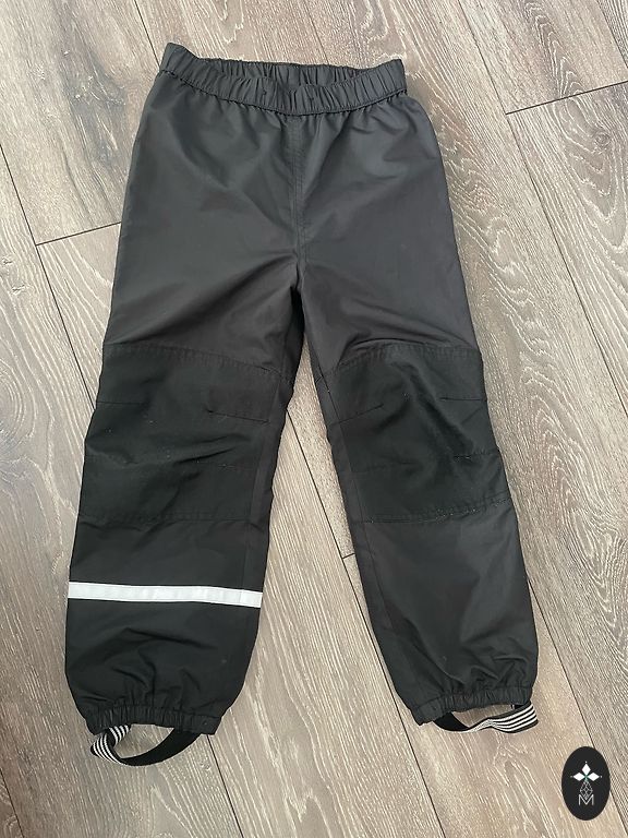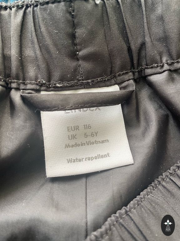 Naujos, vandeniui atsparios Lindex kelnės. Yra dvi šoninės kišenės. Kelnių juosmuo yra elastingas, apimtis reguliuojama dirželiu. Sudėtis: 100% poliamidas. Matmenys: kelnių bendras ilgis 65 cm, ilgis nuo vidinės siūlės 45 cm, juosmens apimtis 2x26 cm, tempiasi iki 2x30 cm. Dydis 110-116 cm. Kaina 20 €