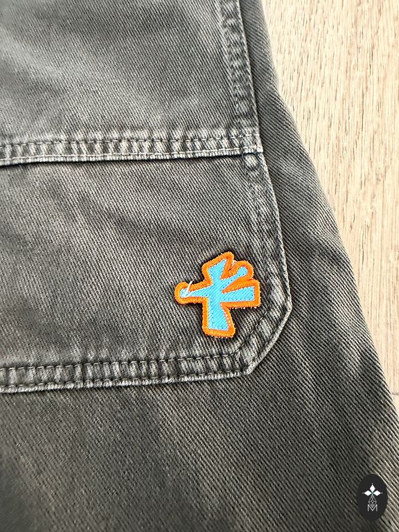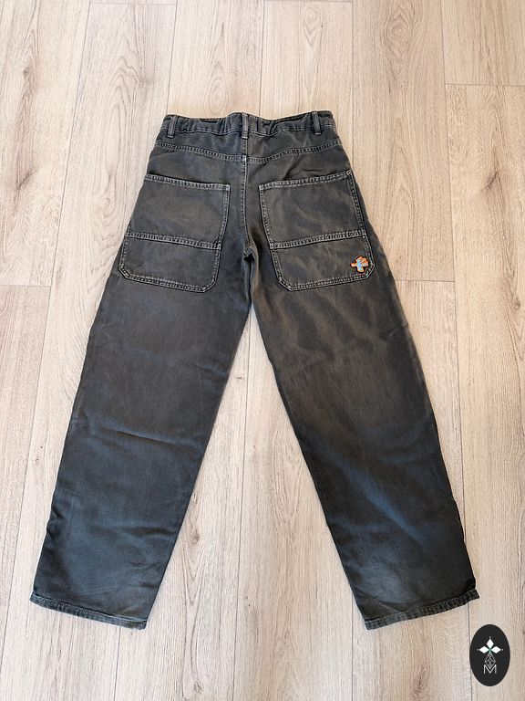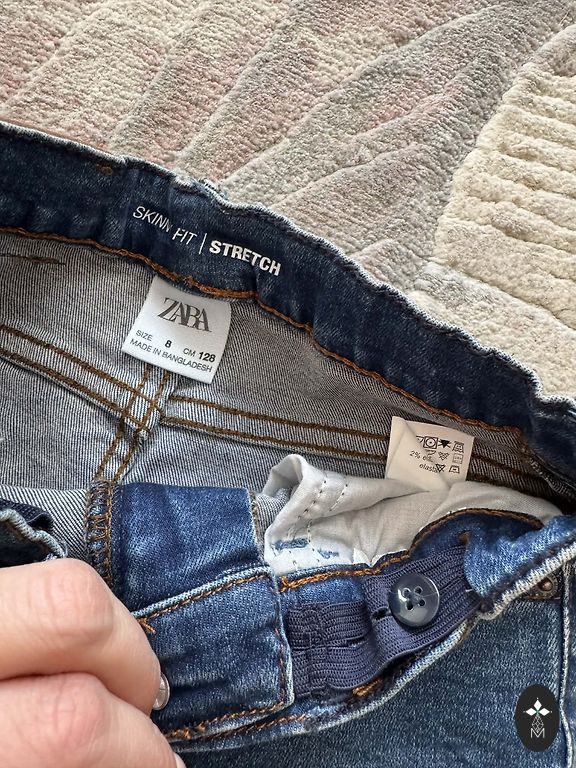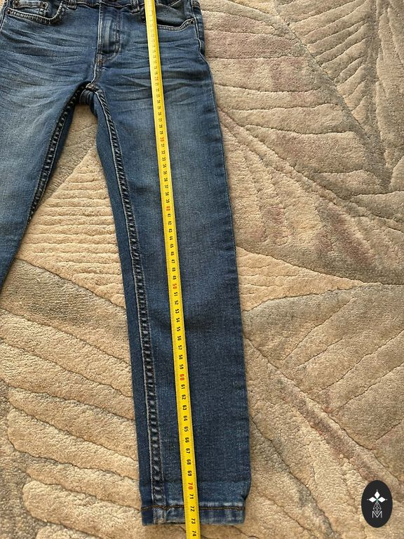 Džinsai su vidiniu reguliuojamu juosmeniu ir sagų užsegimu priekyje. Kišenės priekyje ir užpakalinėje dalyje prisiūtos kišenės.