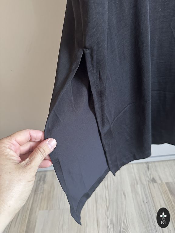 Hebe juoda suknelė su aukso taškeliais.