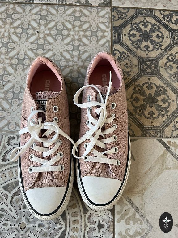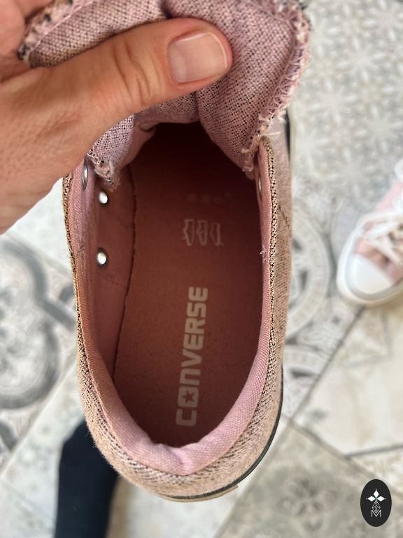 Kā jau gaiši apavi - ir lietojuma pazīmes. Tehniski viss kārtībā (nav saplēstas vai kas tāds), bet gaiši rozā krāsa ir nedaudz pelēcīga no mazgāšanas palikusi un baltā krāsa vairs nav tik balta.