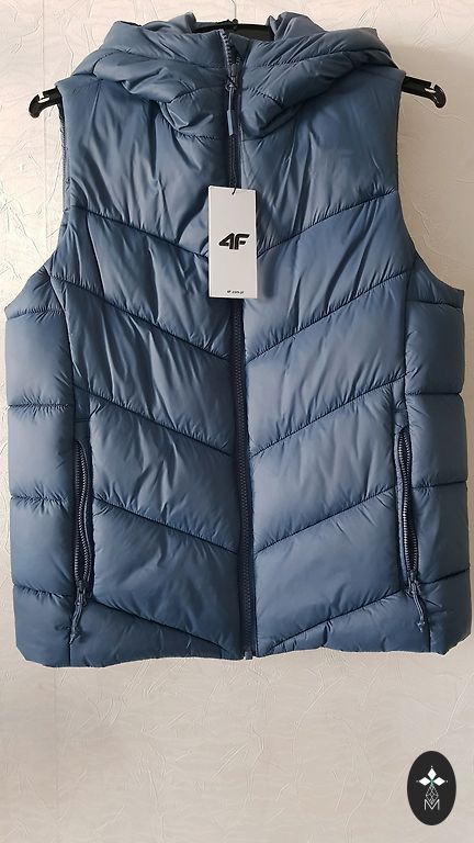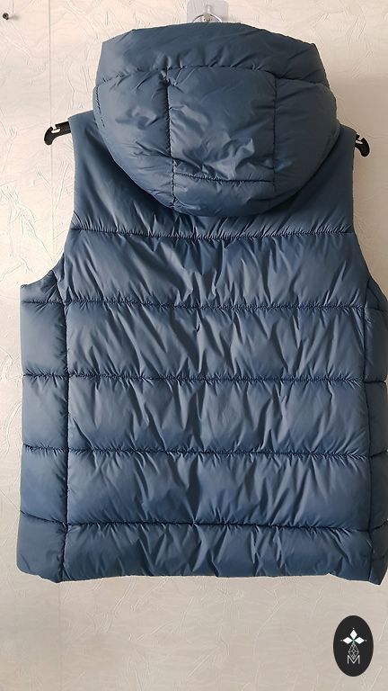 Valge vest pärlmutterläikega. Pikkus 94cm, õlad 40cm. Külgedel taskud. Trukk-kinnis. Kapuuts.