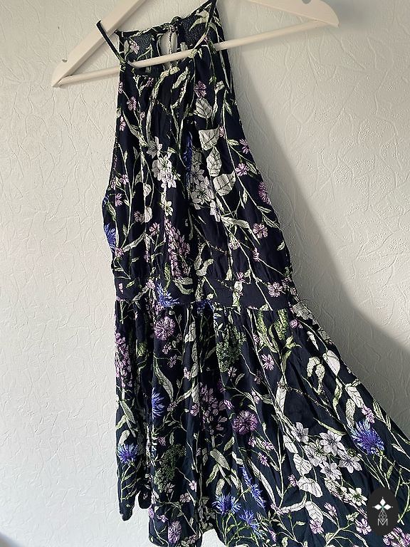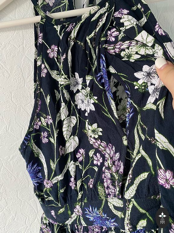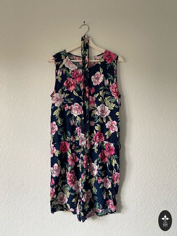 Ikdienas taisna griezuma kleita ar kabatām, neburzīgs audums, 52 izmērs: garums – 102 cm, no paduses līdz padusei – 71 cm, gurnos – 73 cm, piedurknes garums no pleca – 46 cm, piedurkņu galos neliels volāniņš.