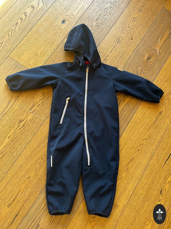 Purchased new, slightly used softshell jumpsuit in dark blue color, has a pocket, no elastic (there are buttons to attach), signs of use on the knees. Underarms 43cm×2, arms from underarm 34cm, leg inseam 51cm, total length from shoulder 111cm.